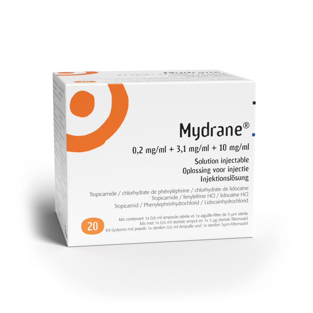 2. Bij het starten van de operatie wordt 0,2 ml Mydrane traag in een enkele toediening, via intracamerale weg, geïnjecteerd door een oogchirurg via de zijpoort of de hoofdpoort. Voor instructies over de manipulatie van het geneesmiddel voorafgaand aan toedien- ing, zie SKP.